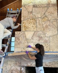Led by TAS Grounds and House Restoration Director Amy Creekmur, the project focused on the first complete cleaning of the fireplace in over 90 years. The fireplace—crafted from a unique blend of local oolitic limestone and fossilized coral from the Upper Keys—had accumulated decades of soot, stains, salt, and other debris, including damage from a past roof leak. RLA Conservation gently cleaned and stabilized the stone, corrected mortar joint deterioration, and restored the fireplace’s structural and aesthetic integrity.